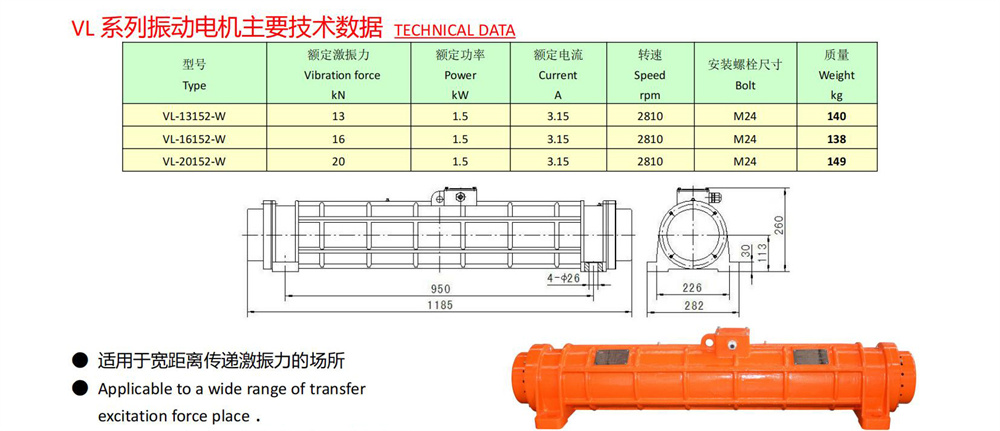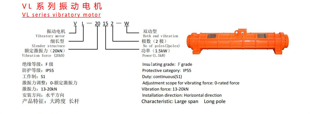 VL系列振动电机,功率1.0~2.2KW,2、4极,激振力为13~35KN,共计10个规格。本系列振动电机主要适用于有色金属矿等行业,与高频     VL系列振动电机筛配套,替代进口的同类振动电机。
