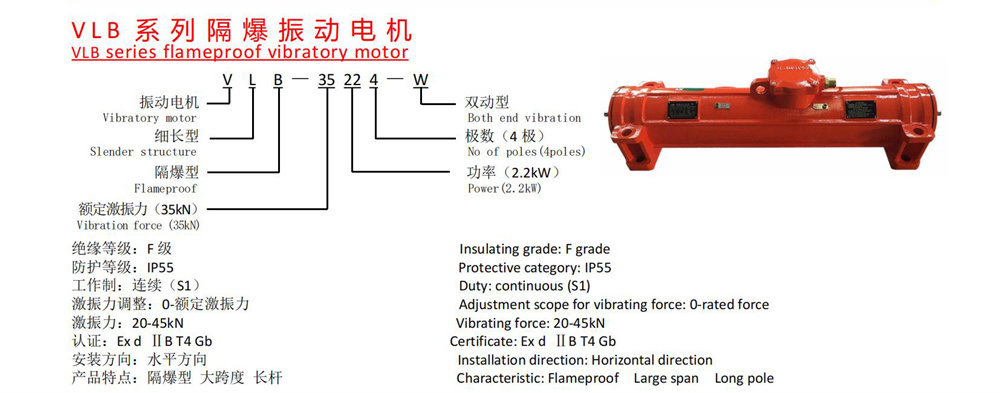 VLB、VLBL系列户外隔爆振动电机设计成细长结构,激振力作用点距离(地脚孔的距离)特宽,尤其适用于宽距离处传递激振力的场合,广泛用作石油行业泥浆分离筛激振源。泥浆分离筛装配此类振动电机,VLB系列户外隔爆振动电机   VLBL系列户外隔爆振动电机运行更平稳,构件受力更均匀,有效延长其使用寿命。VLBL系列是在VLB系列基础上结合油田的使用状况,新研发的一种铝合金壳体的新型振动电机。其结构合理、质量轻,参振质量与同类产品相比大幅度降低。VLB、VLBL系列产品可单独使用,亦可组合使用。其防爆性能符合GB3836.2-2000《爆炸性气体环境用电气设备第二部分:隔爆型“d”》的规定,防爆标志为dIIBT4,适用于 II类A、B级T4组别可燃性气体或蒸汽与空气形成的爆炸性混合物的场所。