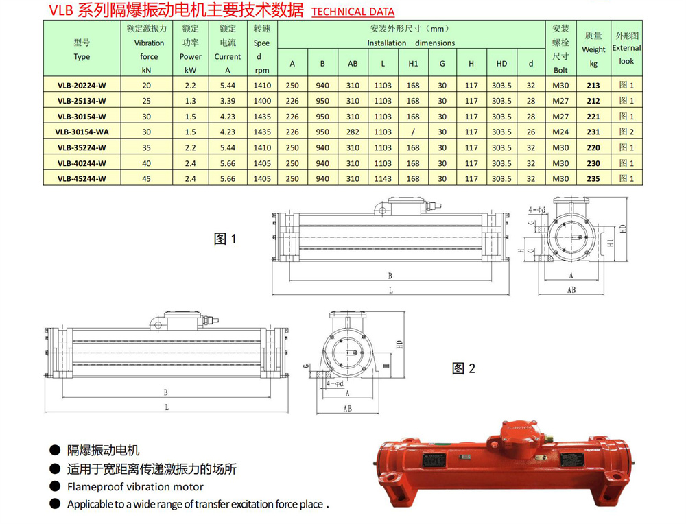 VLB、VLBL系列户外隔爆振动电机,功率1.1~3.6KW,4极,激振力为20~60KN,共计14个规格。广泛应用于油田、矿山、化工等行业。